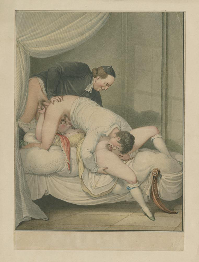 Woman, man and priest engaged in sexual activity, 19th century, Hand …