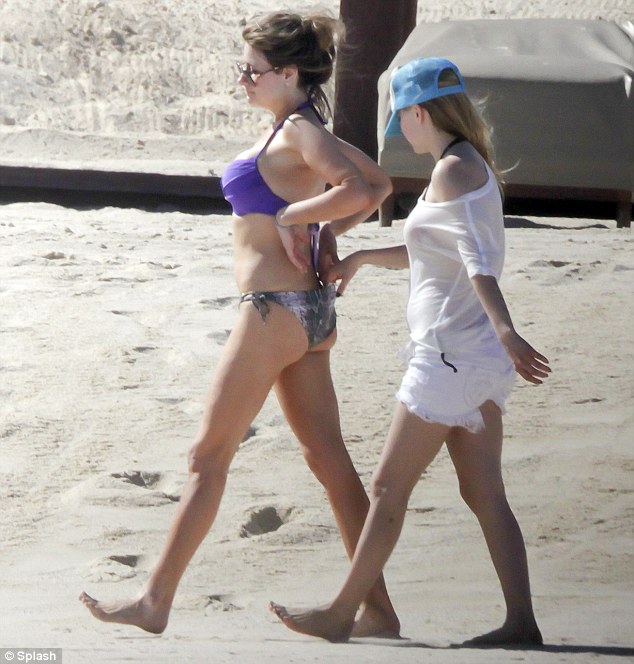 Cheeky: Avril tucks in the label of her friend’s bikini pants as they …