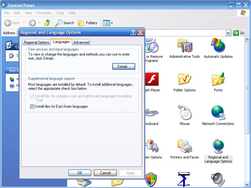 Installing East Asian Language Support Files for Windows XP