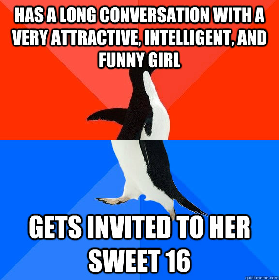 Has a long conversation with a very attractive, intelligent, and funny girl Gets invited to her …