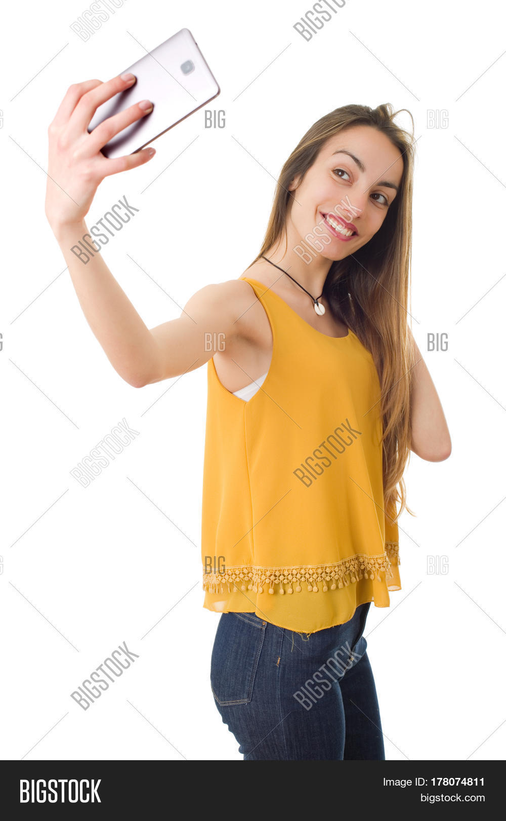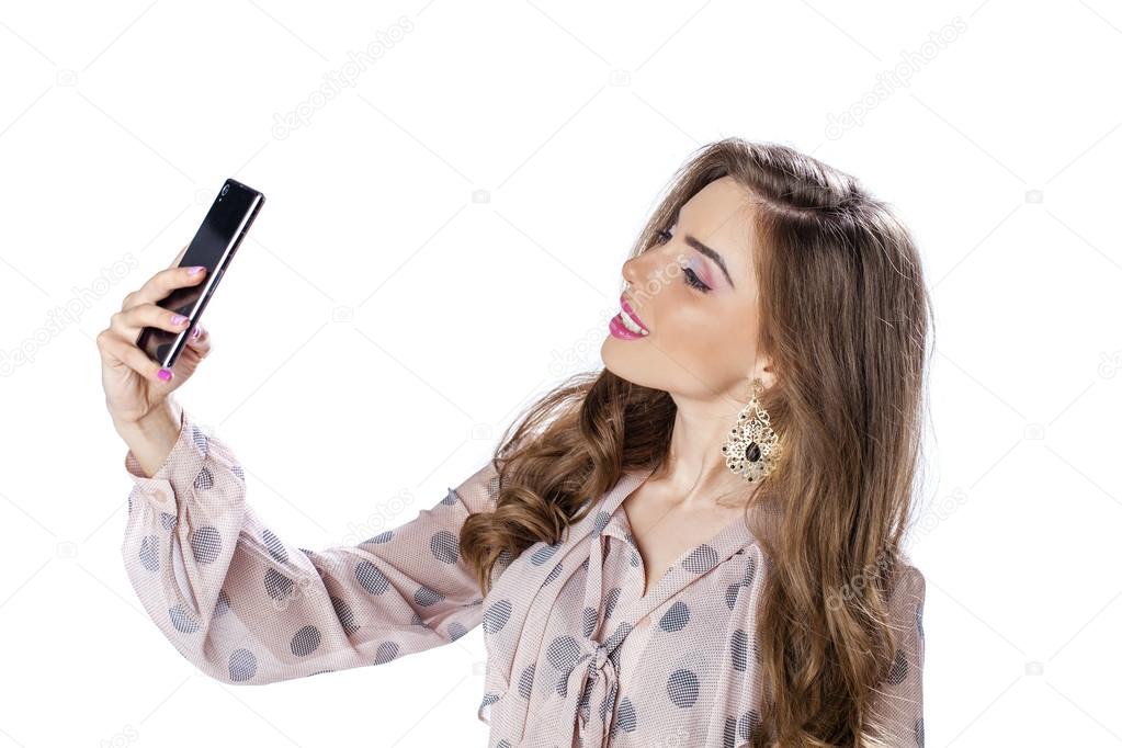 Beautiful woman smiling and taking a selfie, isolated over a white …