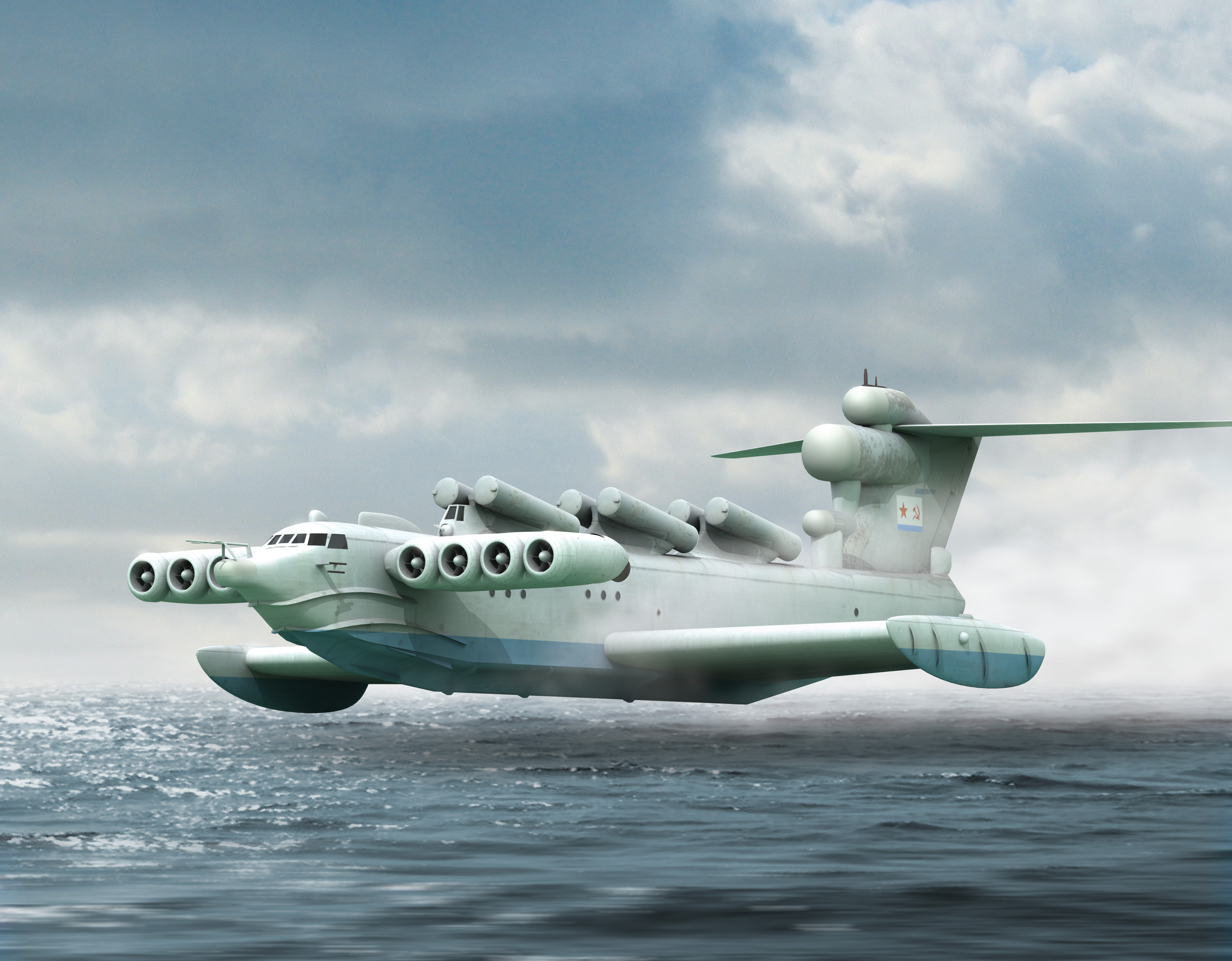 front 3-4 shot of the Soviet Cold War era Ekranoplan (or Caspian Sea …
