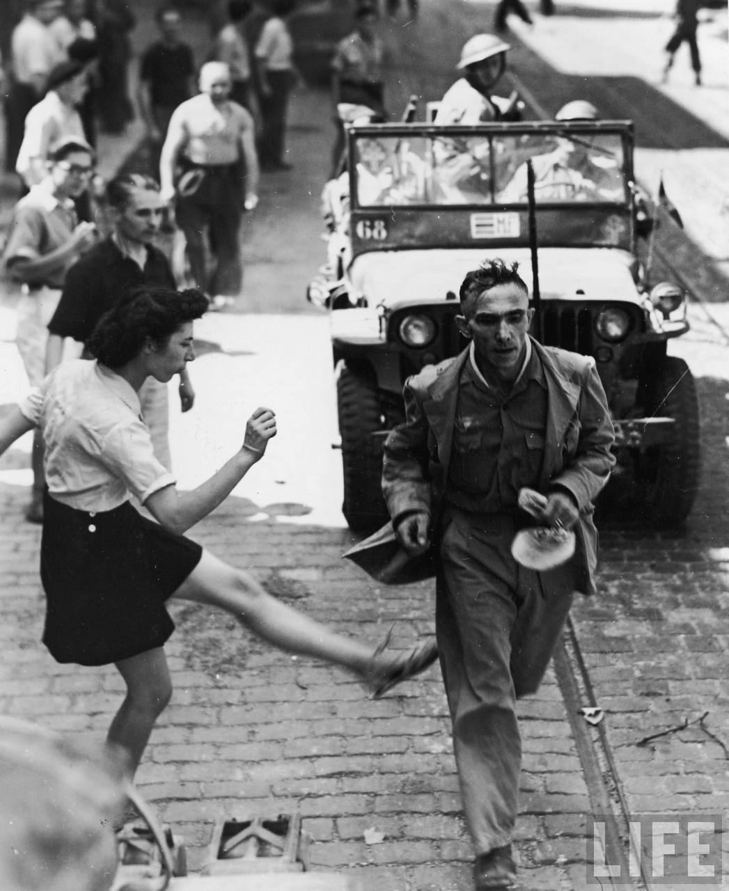 French girl vents anger by kicking at a passing German prisoner
