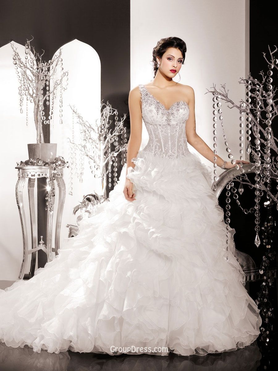 One Shoulder Organza Winter Wedding Dress with Ruffled Skirt – GroupDress.com