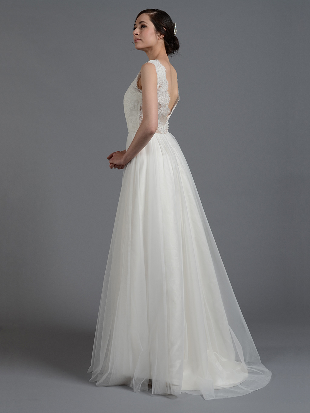 Ivory sleeveless lace wedding dress with tulle skirts