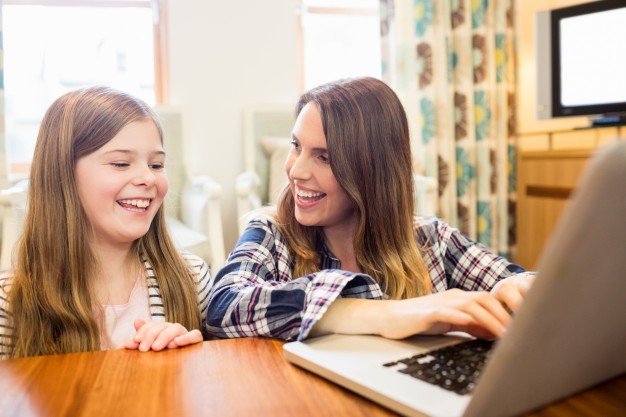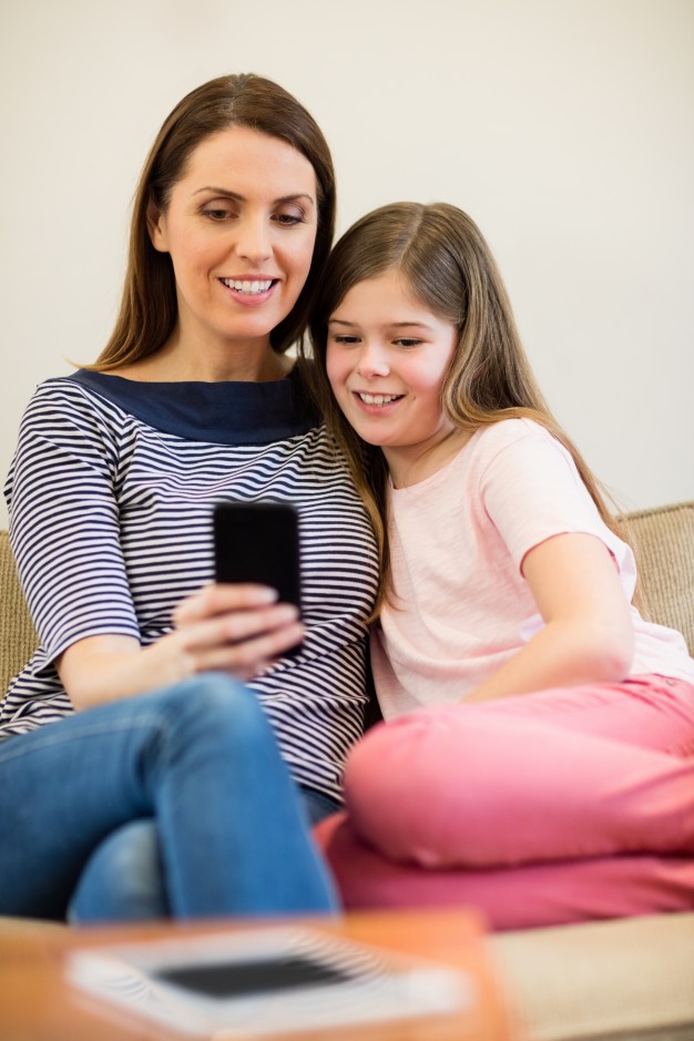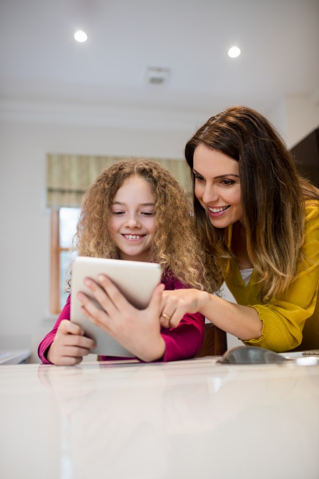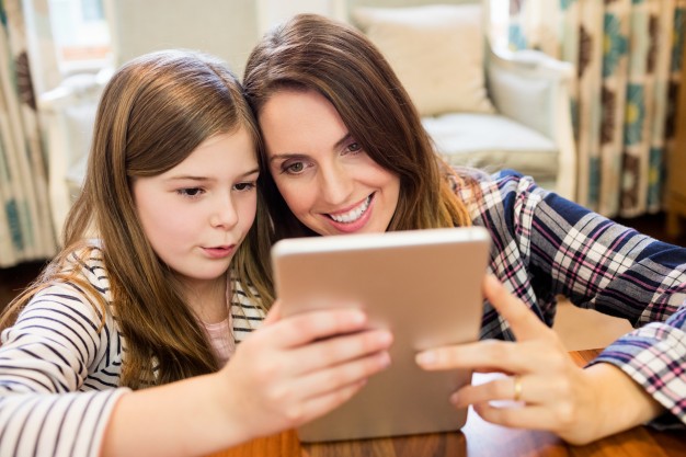 … and daughter using digital tablet in living room Photo | Free Download