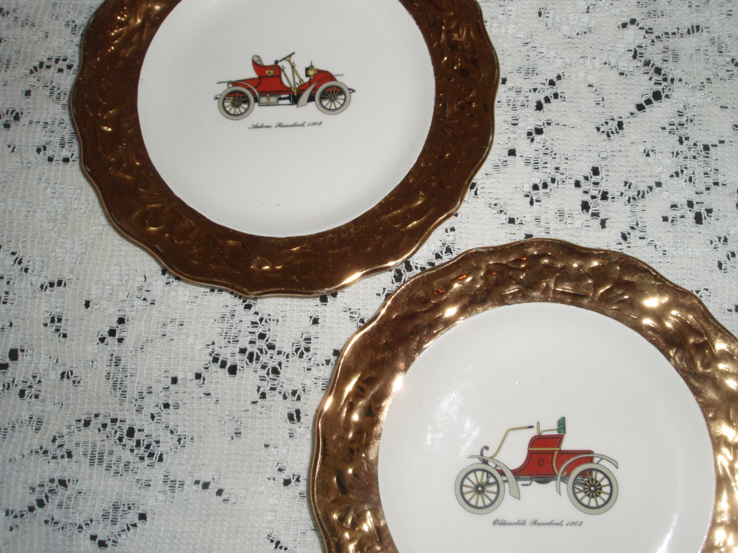 Antique Car Plates Two Porcelain white plates with heavy gold